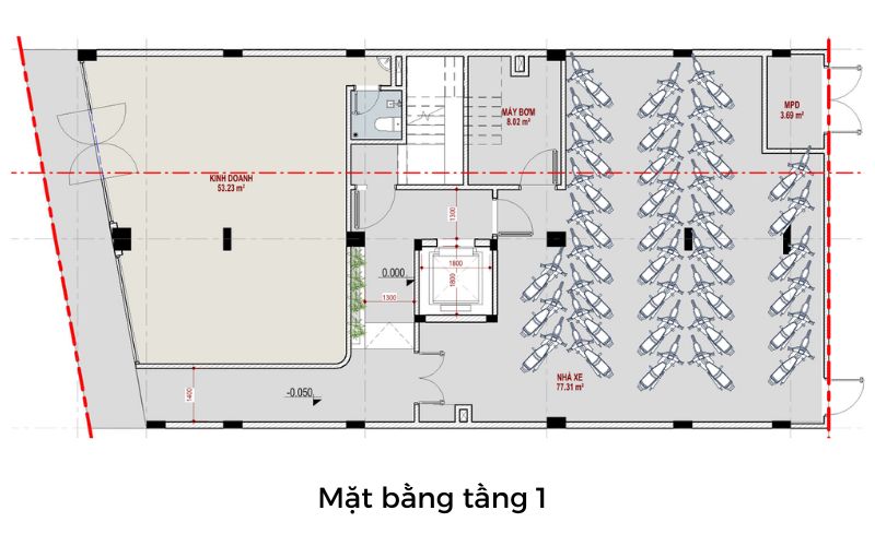 - Tầng 1: Phòng kinh doanh, khu vự để xe, nhà vệ sinh, phòng kỹ thuật, hệ thống thang máy và thang bộ.