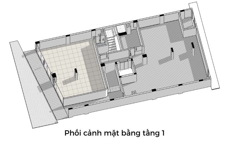 Với thế đất hình thang (nở hậu nhẹ, chiều dài một cạnh lên tới hơn 21m), bài toán đặt ra cho AFTA là làm sao bố trí được nhiều phòng nhất nhưng giao thông vẫn thuận tiện. Dưới đây là phương án bố trí mặt bằng chi tiết: