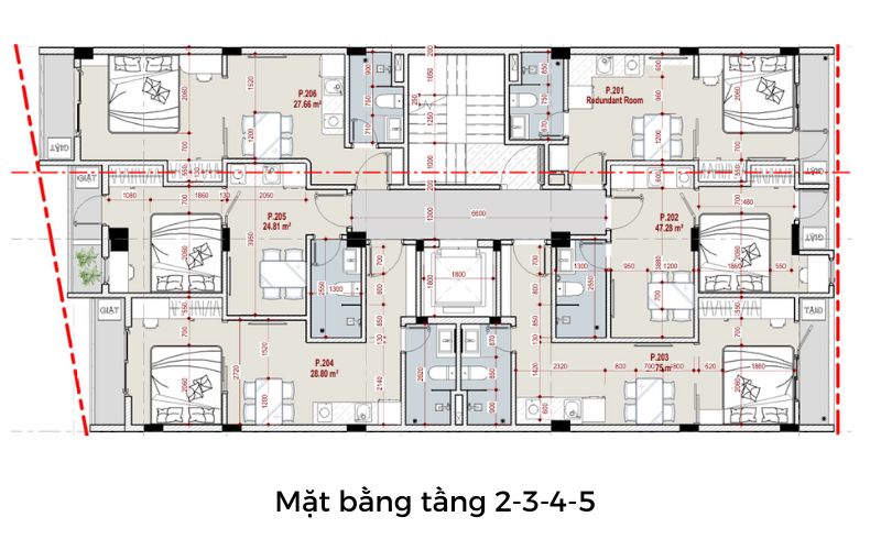 - Tầng 2, 3, 4, 5: Gồm 6 căn hộ cho thuê đầy đủ tiện nghi có cả ban công và nhà vệ sinh riêng, sảnh thang và hệ thống thang bộ, thang máy.