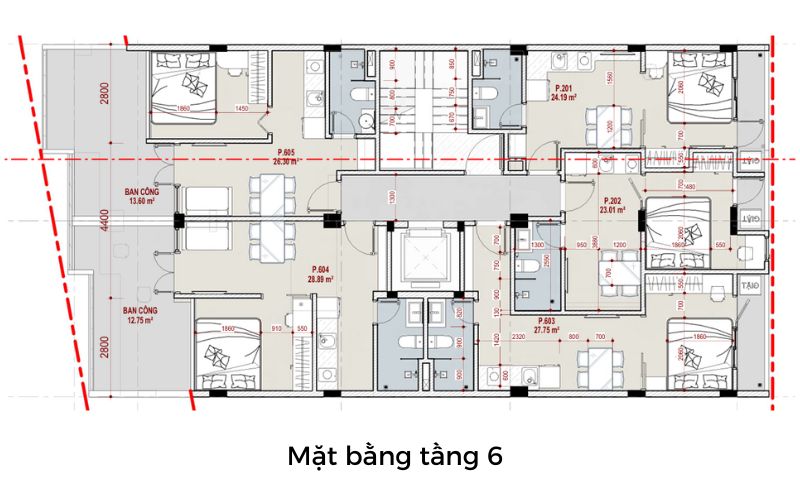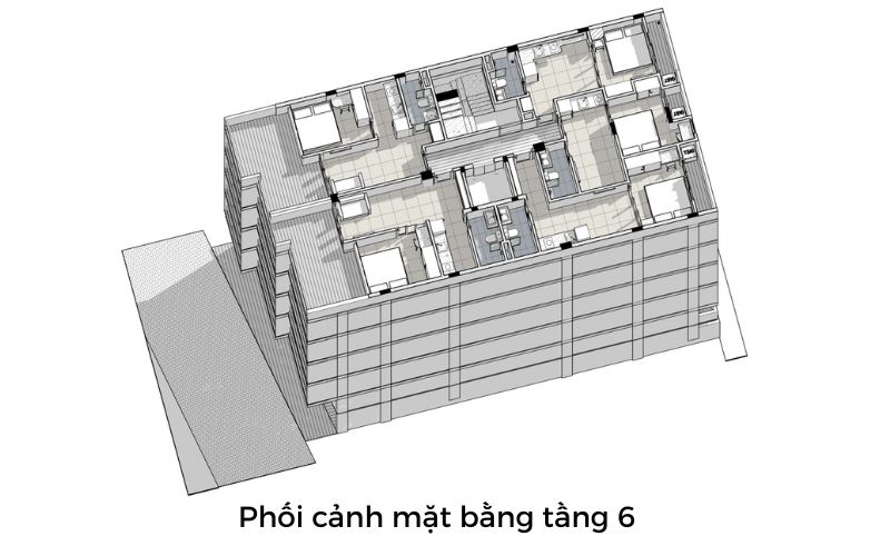 - Tầng 6: Gồm 5 căn hộ cho thuê đầy đủ tiện nghi có cả ban công và nhà vệ sinh riêng, sảnh thang và hệ thống thang bộ, thang máy.